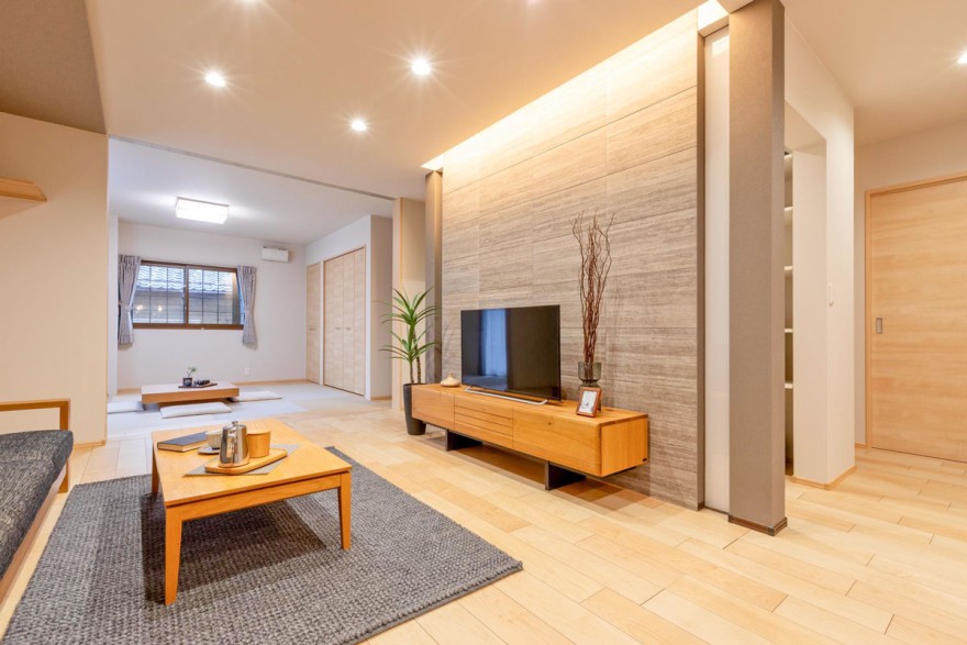 LDKと隣接した和室は、建具を天井の高さまで設けました。 開け放つとLDKの一部になります。 また、既存の和室で使用していた掛軸がありましたので、この和室にも床の間的な空間を設け、掛軸を飾れるようにしました。 収納とお仏壇も同じ建具に統一し、モダンな和室として違和感なく調和させました。