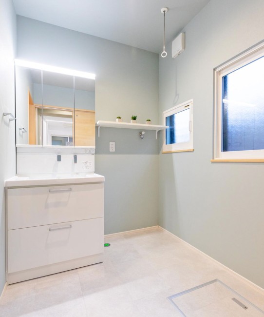 洗面所と脱衣所を別々に配置し、常時洗面所を利用できるように提案しました。脱衣所には、しっかりと可動棚と衣服の仮置きカウンターを設置することをご提案しており、狭いスペースでもタオルや着替えを収納できます。