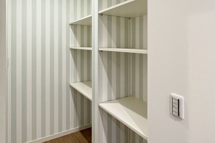 多くの物を収納できます。出入り口はオープンになっていますが、収納部分が見えにくい配置になっているため、リビングからは気になりません。