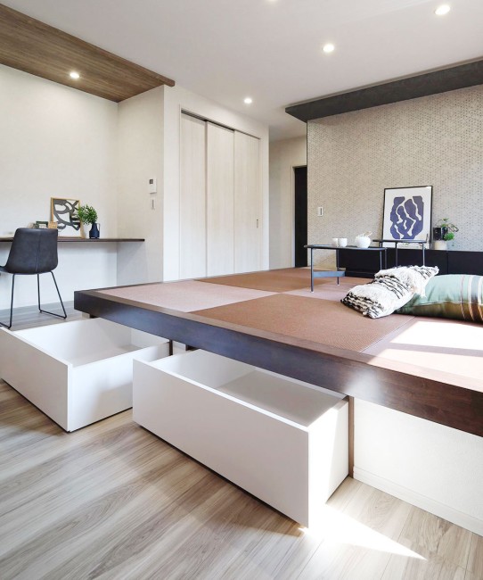 畳コーナーは壁のアクセントクロスに和モダンな柄をご提案。天井段差をあえて設けて広い空間を引き締める工夫を取り入れました。 椅子の高さ程度まで上げた畳コーナーなので、ダイニングに座る方との目線が合い、会話も弾みます。高くした分の床下に引き出し収納を造作したことで、畳コーナーに物が散らからないようにできました。