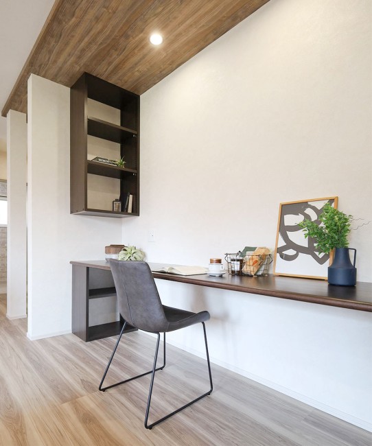 LDKの一角に設けたワークスペース。実はカウンターの高さはちょっとだけ高めです。カウンターの下をワンちゃんのゲージを置くスペースとしても使いたいというご要望に合わせて施工しました。ワンちゃんグッズもカウンター下の棚に収納。カウンターでは奥様がレシピを調べたり、ワークスペースとして使ったりといろんな使い方ができます。構造上抜けない柱を利用した空間でもあります。天井の木目調クロスは空間のアクセントに。