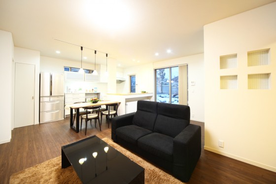 間接照明を多く取り入れた、高級感あふれるLDKです。自然と家族が集まる暮らしの中心となる空間です。