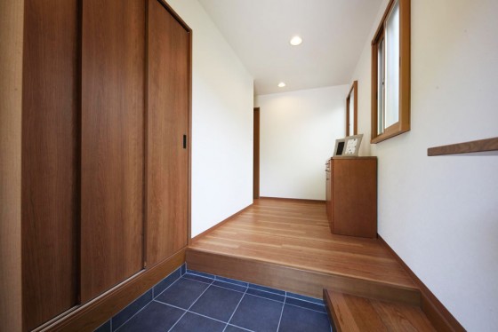 ポストまでサンダルを履いて取りにいかないといけなかったストレスを、一段下げた位置に踏み込みを作ったことでなくしました。エントランスクロークは3枚引違戸で出入りも楽々です。